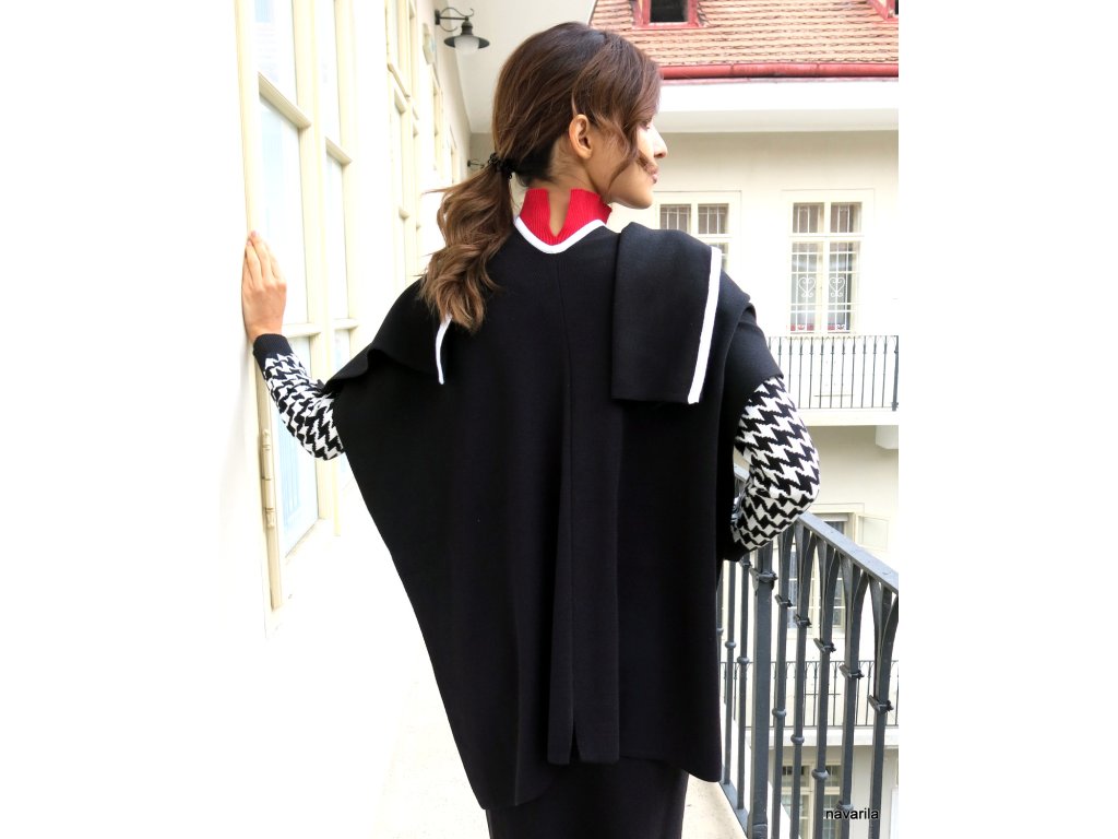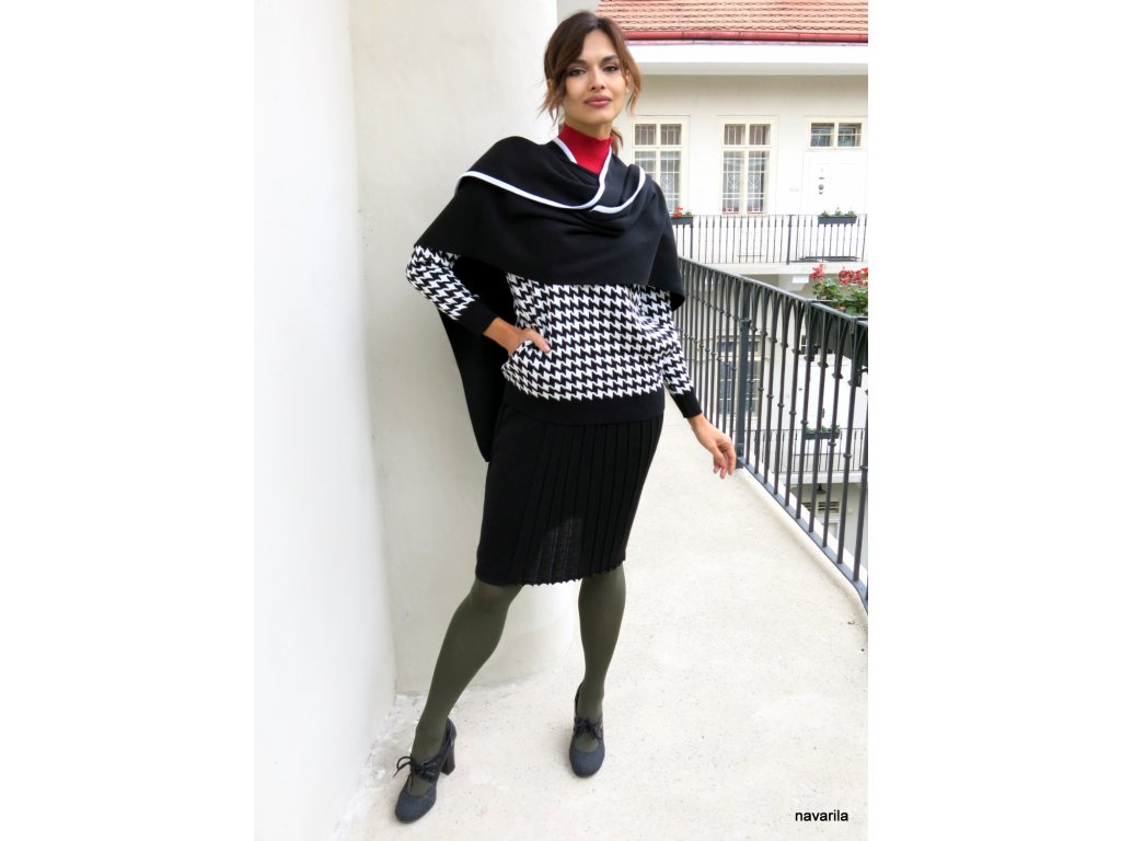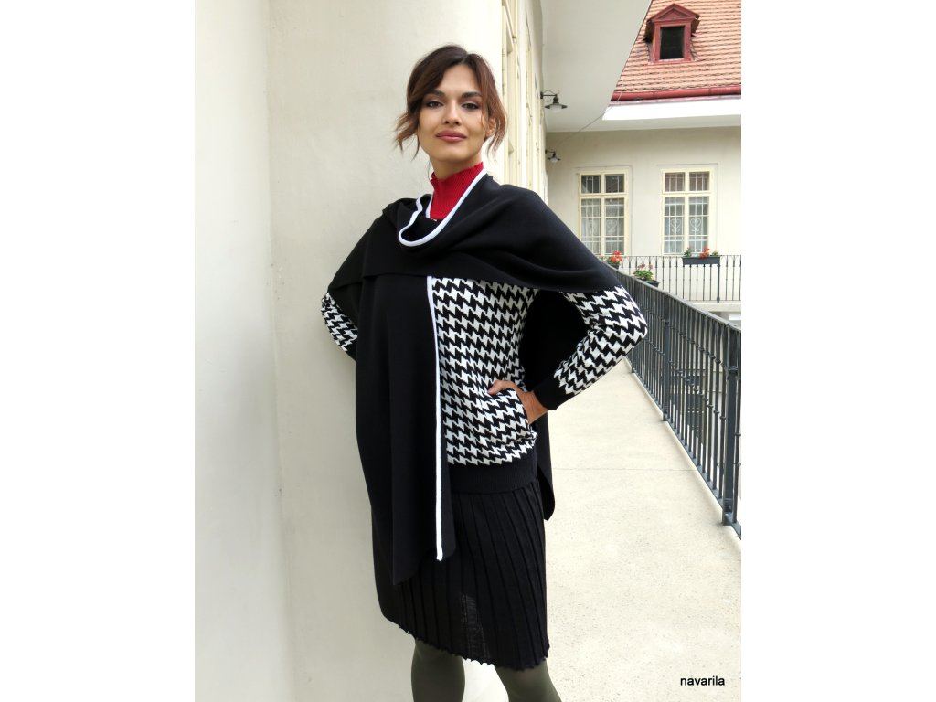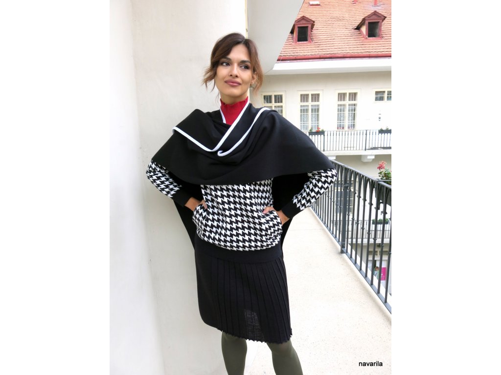 Pončo, pléd, pelerina, pleteno z biobavlny 50/50, lemované bílými dutinami, variabilní a elegantní, zahřeje i doplní večerní outfit. Veškeré modely jsou již předeprány, údržba praním v pračce na jemný program max.do 30 st. Po vyprání rozprostřít. Bez velikostí, rozměry 80x150cm Barevnost: a/černá s bílými nebo šedými lemy b/tm.modré s bílými lemy Spodní rolák KOKA se vzorem kohoutí stopy.