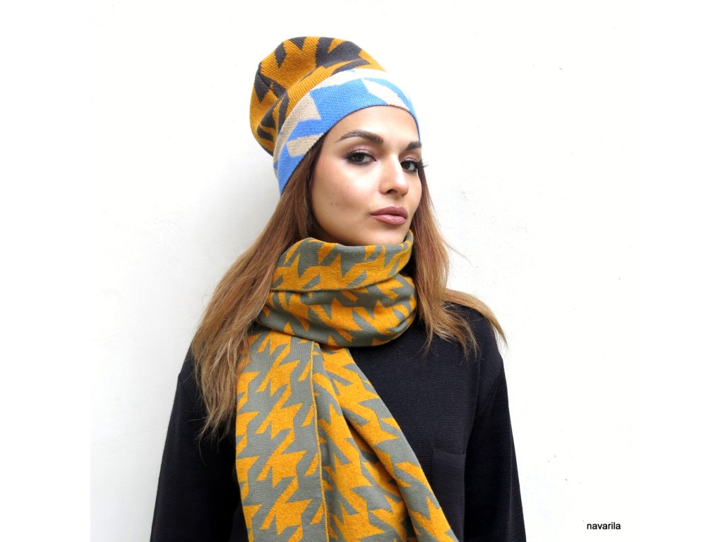 Módní doplněk čepice Hlavní barva hořčicová Doplňkové barvy modrá khaki Materiál textil Určení unisex Technika výroby pletení Materiál: textil bio bavlna merino směs vlna úplet Styl extravagantní hravý veselý