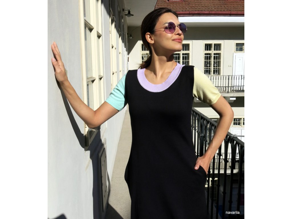 Nepřehlédnutelné černé originální šaty ke kolenům, s krátkými jinobarevnými rukávy a lemováním výstřihu. V boku mají všité kapsy, takže je budete milovat! Materiál - směsová příze ve složení 50% organická bavlna a 50% polyester. Veškeré modely jsou již předeprané, bavlněná příze chladí a nežmolkuje - údržba velice praktická - praní v ruce nebo pračce na jemný program. Na objednávku do 10 dnů Vel. S, M, L, XL