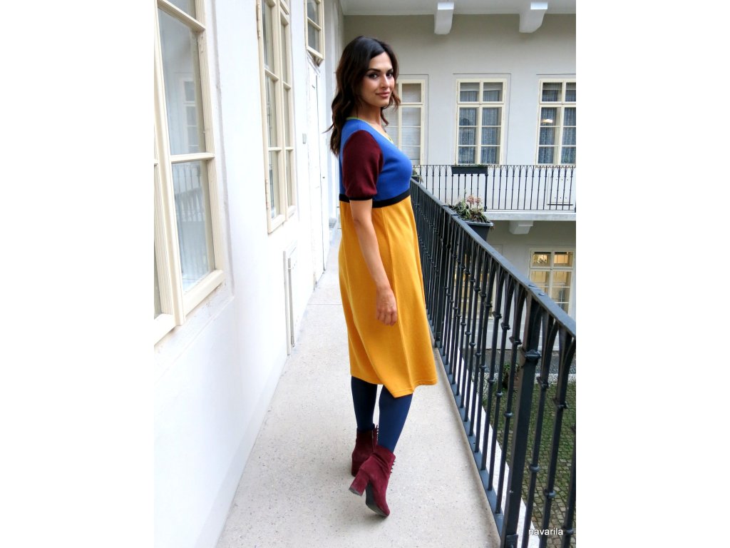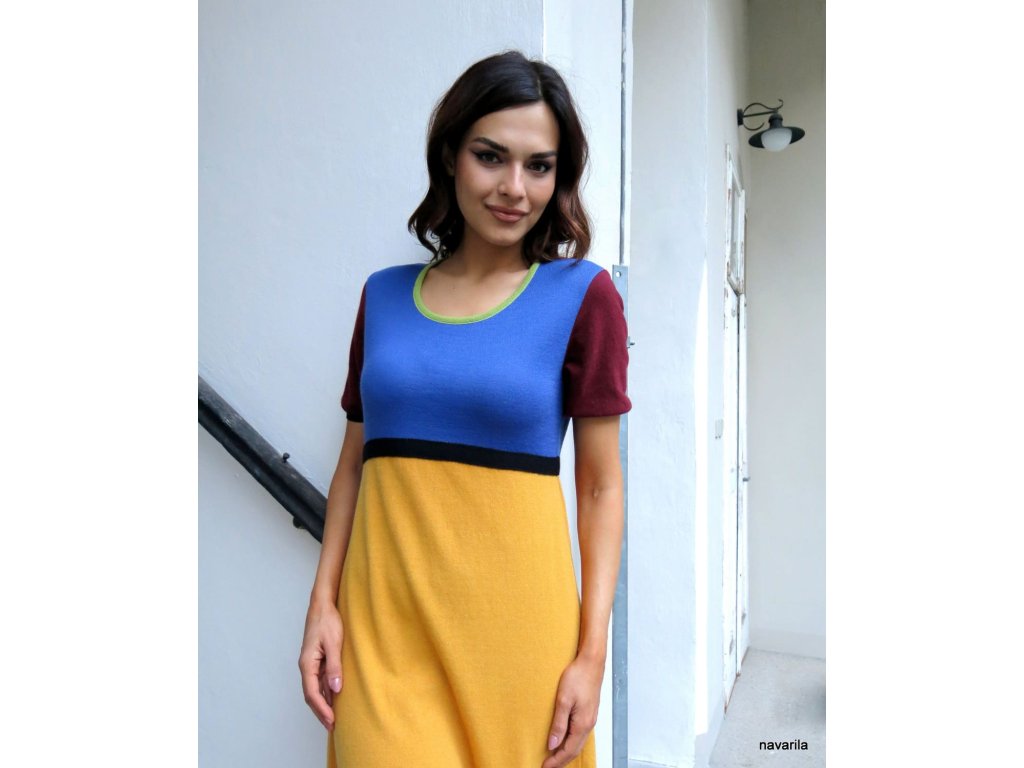 Jediné a jedinečné originální pletené šaty v kombinaci vícebarevných dílů, s bordó rukávy, se žlutou sukní, černou linkou a zeleným lemováním ve výstřihu. Materiál - směsová příze ve složení 50% merino vlna + 5 % kašmír +10 % hedvábí + 35% polyester. Veškeré modely jsou již předeprané, příze nekouše, nežmolkuje- údržba velice praktická - praní v ruce nebo pračce na jemný program. Jediný originální model- vel. M.