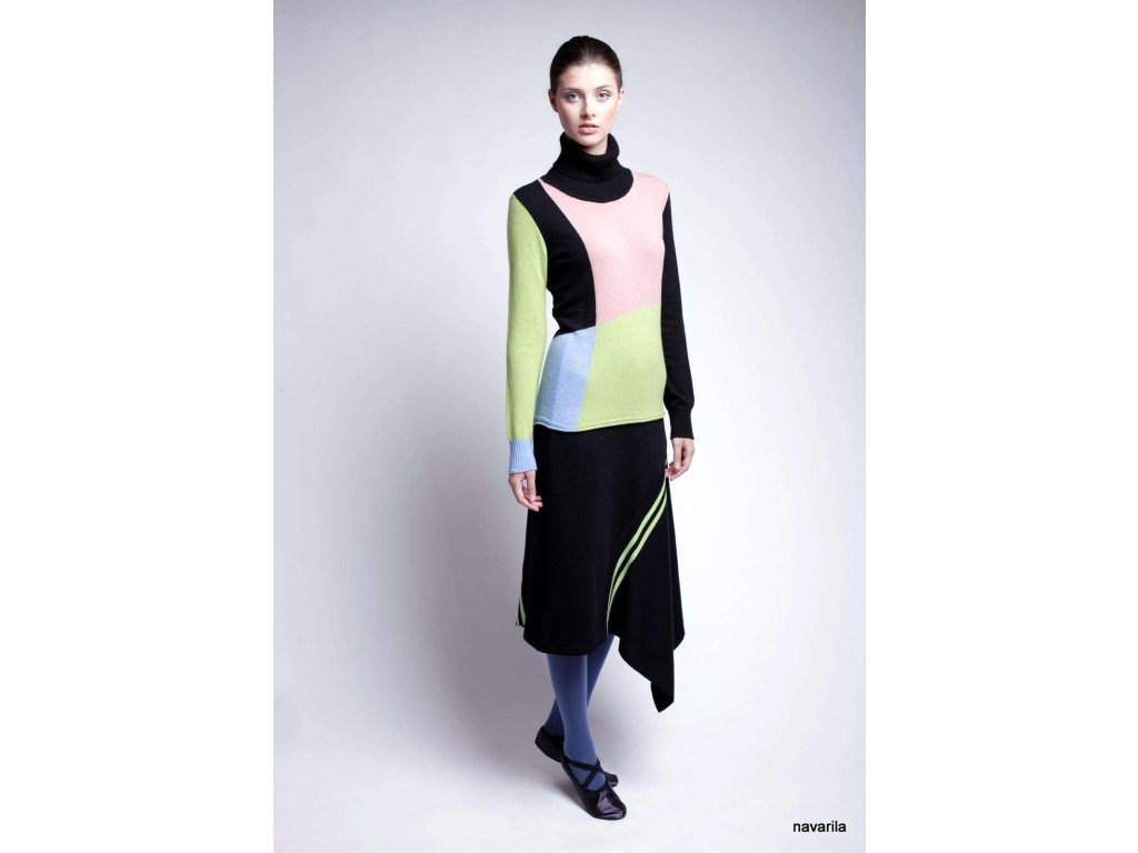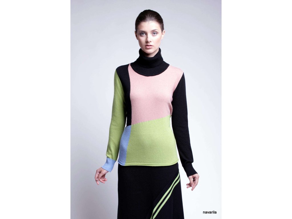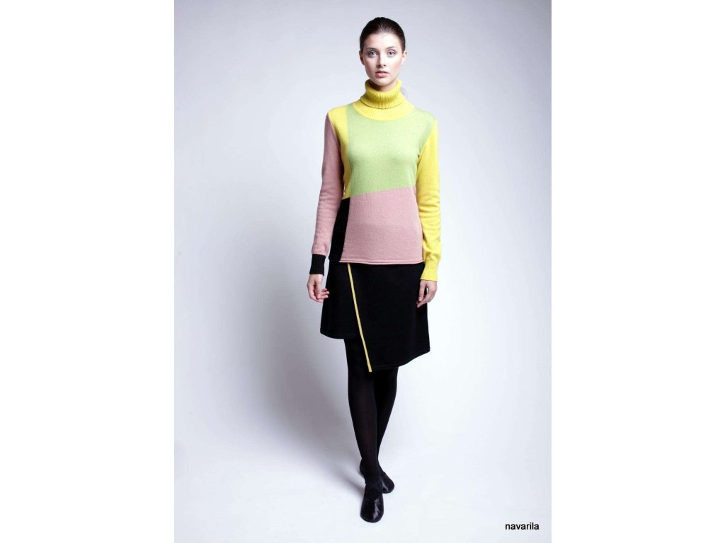 Jemný pulover HOUME s dlouhým rukávem a geometrickým dělením na PD i ZD a vysokým rolákem. Je pletený z nádherné příze s příměsí kašmíru. Vybírejte z 2 barevných kombinací : A/žlutý rolák, vzor zelený, žlutý, starorůžový a černý- VEL. 42,46 B/ černý rolák, vzor zelený, sv. modrý, růžový a černý - VEL. 42,44,46 Do barevné kombinace ke všem sukním z kolekce LINEART. Veškeré modely jsou již předeprané, údržba: jemné praní do 30 st, potom rozprostřít na ručník.
