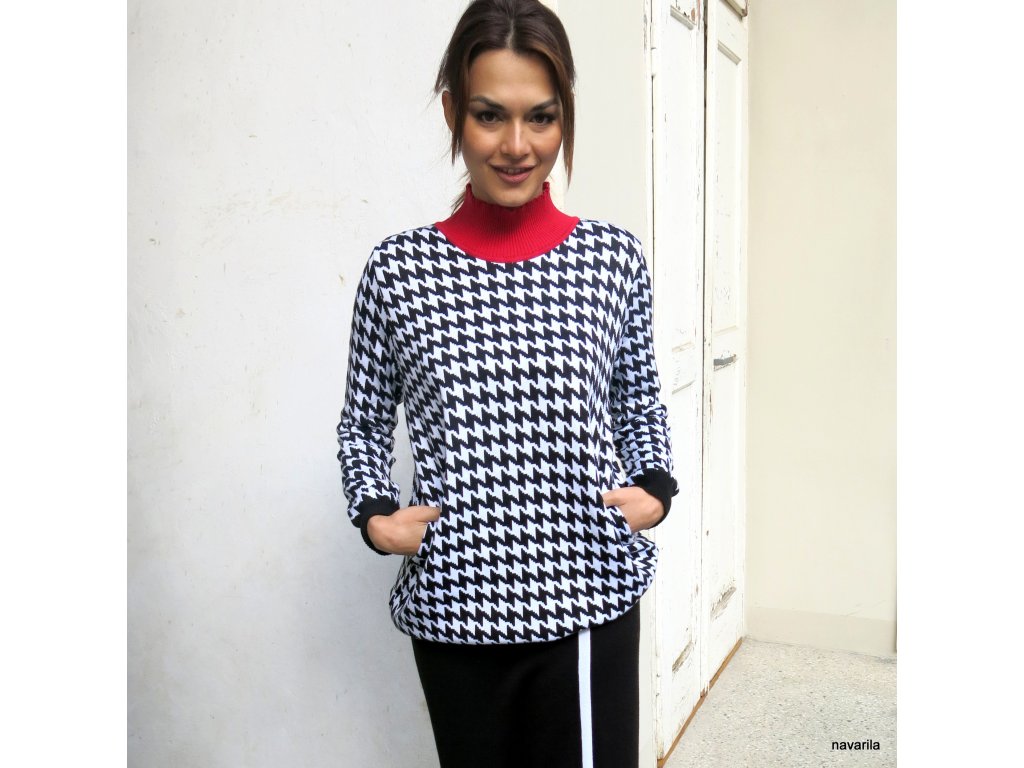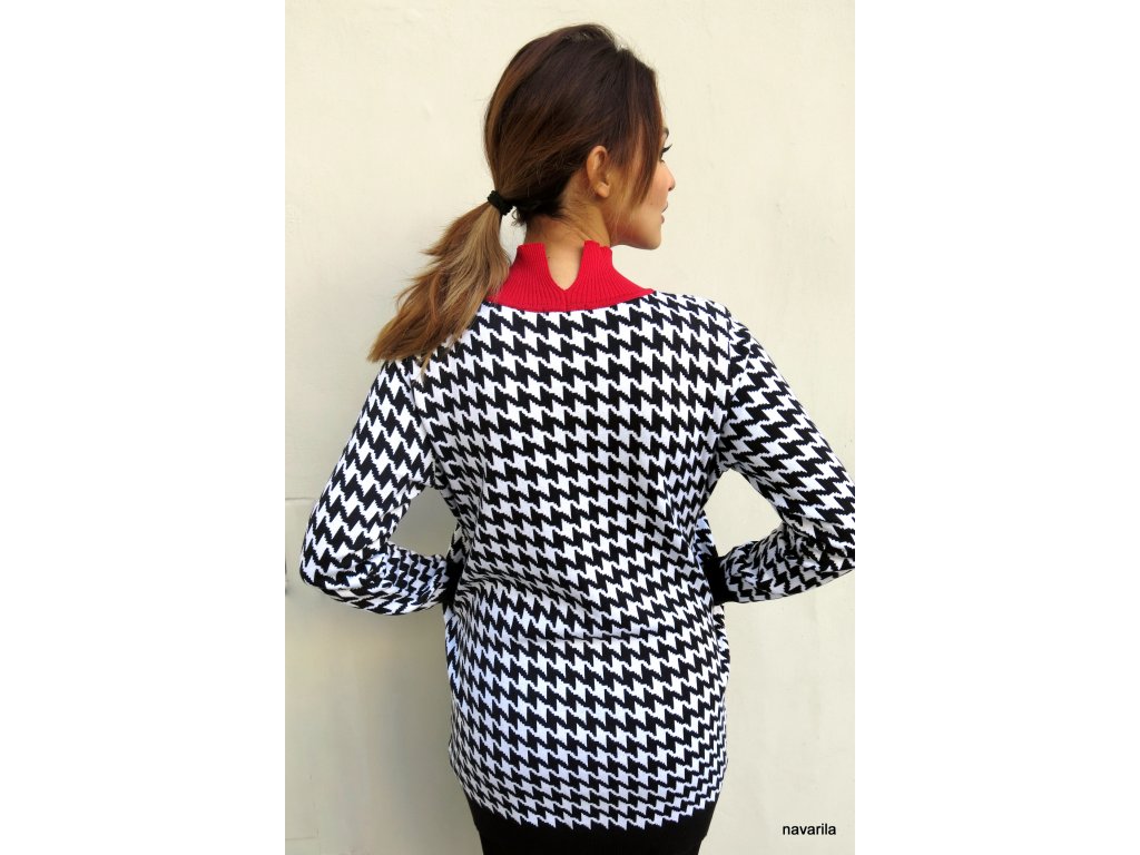 KOKA- maxisvetr nebo minišaty s kapsami a červeným rolákem jsou pletené klasickým žakárovým retro/pepitovým vzorem. Směsová příze s organickou bavlnou je příjemným materiálem, vyznačuje se jednoduchou údržbou- praní do 30st v pračce. Údržba je velmi jednoduchá : Po vyprání do 30 st. šaty rozložit na ručník nebo vyvěsit. Vel. S,M,L,XL Nabízíme originál v barevnosti-černobílý vzor a červený rolák, velikost UNISIZE - XL. Veškeré modely jsou již předeprány.