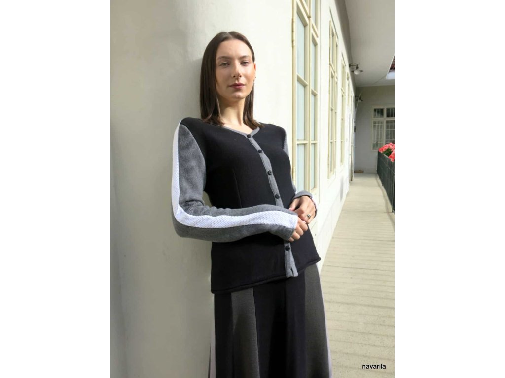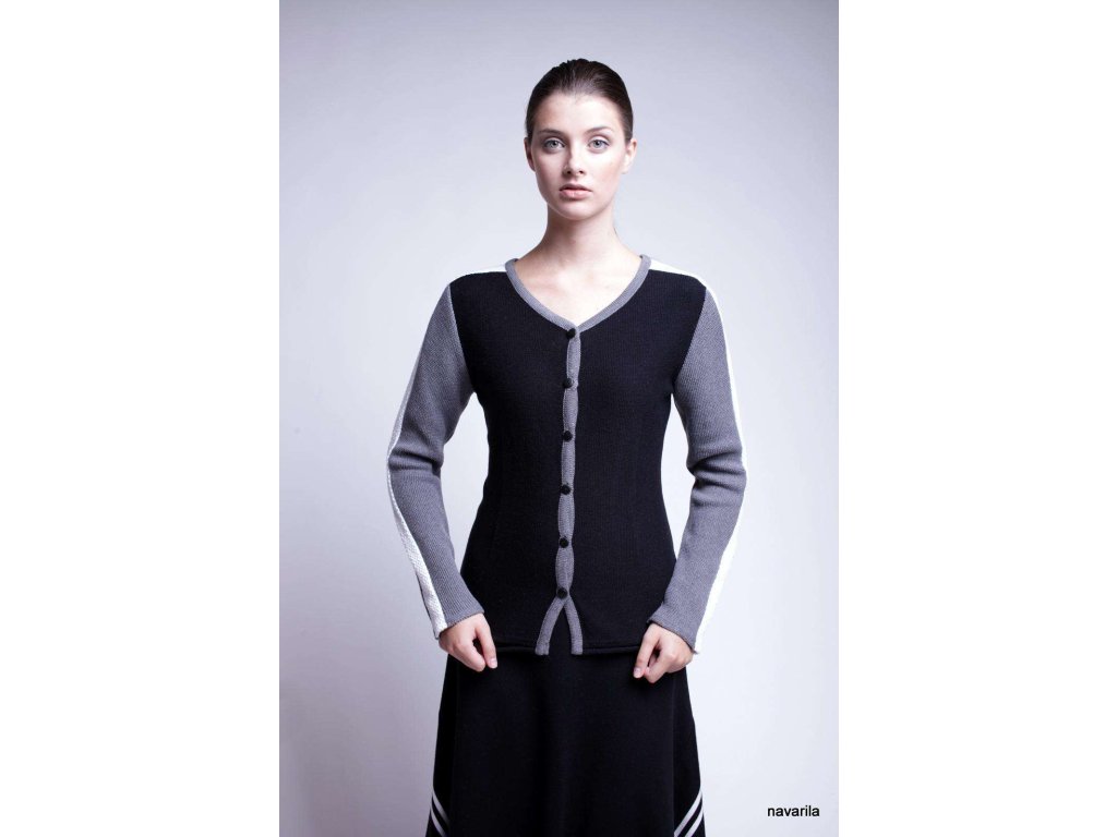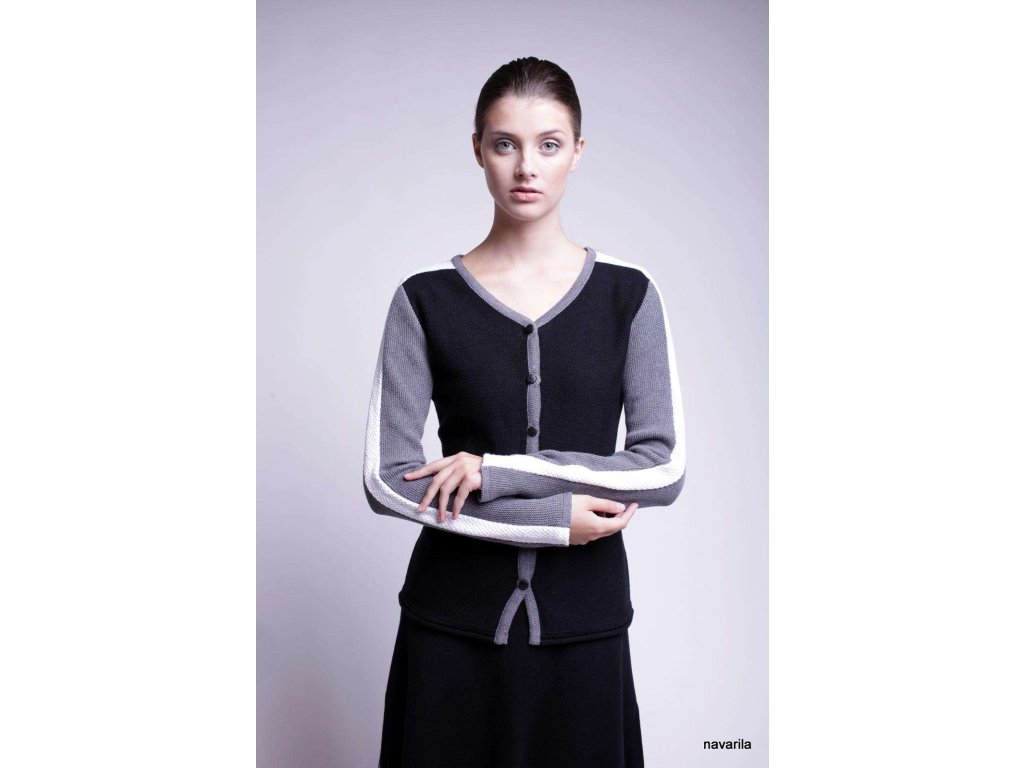 Projímané pletený kabátek LORD z hrubé pleteniny a všívanými pruhy na rukávu, které přechází až do ramene. Pletené z velmi kvalitní a na omak příjemné příze, ve složení 50/50 certifikované bavlny a polyesteru, který zaručuje stálost a nemačkavost úpletu. Veškeré modely jsou již předeprané, údržba: jemné praní do 30 st, potom vyvěsit nebo rozprostřít na ručník. Vel. 36-46 Barevnost: černý základ, rukávy šedé, pruhy bílé
