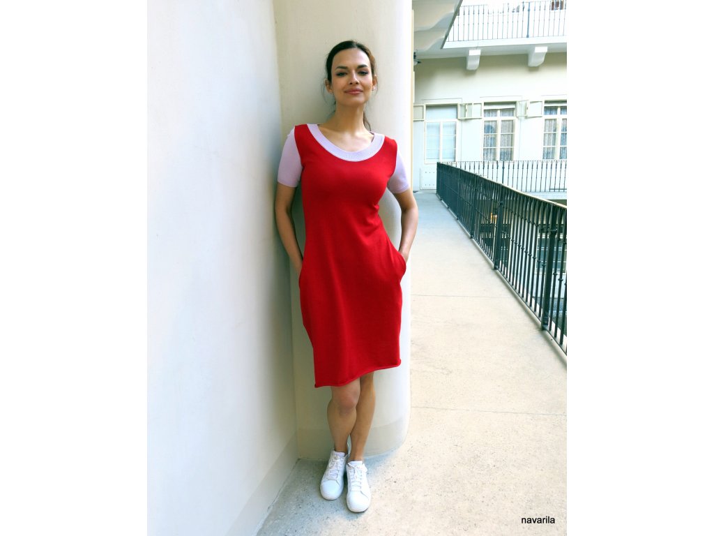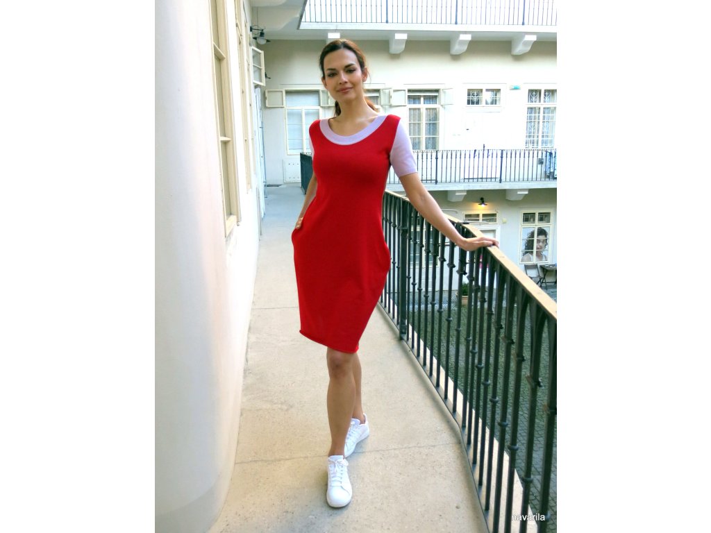 Trojbarevné pouzdrové šaty ke kolenům, vpředu červené a vzadu cihlové. Krátké rukávky a ozdobné lemování výstřihu krásně propojuje růžová, prostě Májovky! V boku mají všité růžové kapsy, takže je budete milovat! Materiál - směsová příze ve složení 50% organická bavlna a 50% polyester. Na objednávku do 10 dnů. Veškeré modely jsou již předeprané, bavlněná příze chladí a nežmolkuje - údržba velice praktická - praní v ruce nebo pračce na jemný program. Na objednávku do 10 dnů Vel. S,M,L,XL