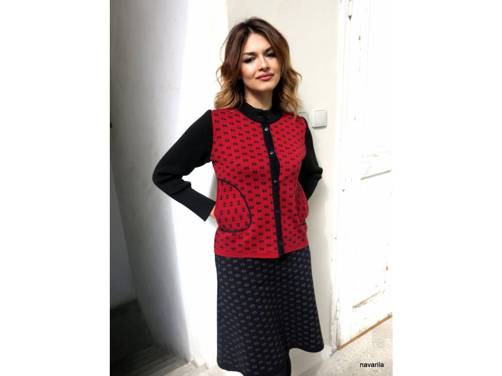 Červené vzorované sáčko vzniklo recyklací zbylých dílů, které čekaly na nový život. Pleteno žakárovým vzorem z bavlněné příze zaručí ten nejměkčí omak všem, co je vlna kouše. Černé rukávy, límec a léga, našívané kapsy a zapínání na knoflíky. Jemně projmuté v pase. Další velikosti na objednávku do 10 dnů. Modely z recyklovaných dílů nemohou být nikdy úplně stejné! Každý model je originál. Možno doplnit krásnými originálními šaty stejného vzoru nebo sukní. Složení příze - 50% bavlny+ 50% polyesteru. Všechny naše modely jsou již předeprané, materiál nekouše, nežmolkuje- údržba velice praktická - praní v pračce na jemný program.