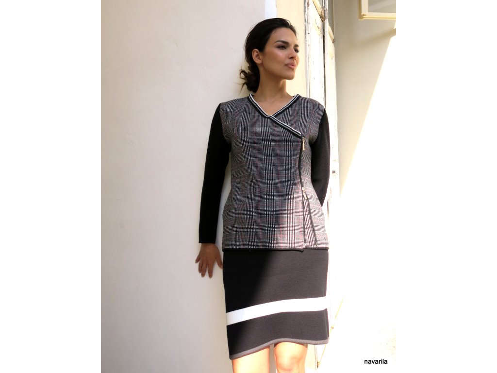 Sukně NIKA je originální sukně v délce 55 cm/ke kolenům, pletená pevnou vazbou z organické bavlny, s bílým pruhem a šedou dutinkou lemující dolní kraj, v pase dutinka s gumou. Pleteno ze směsové příze ve složení: 50% bavlny a 50% polyesteru. Nekouše, nežmolkuje, údržba velice praktická - praní v pračce na jemný program do 30 st.