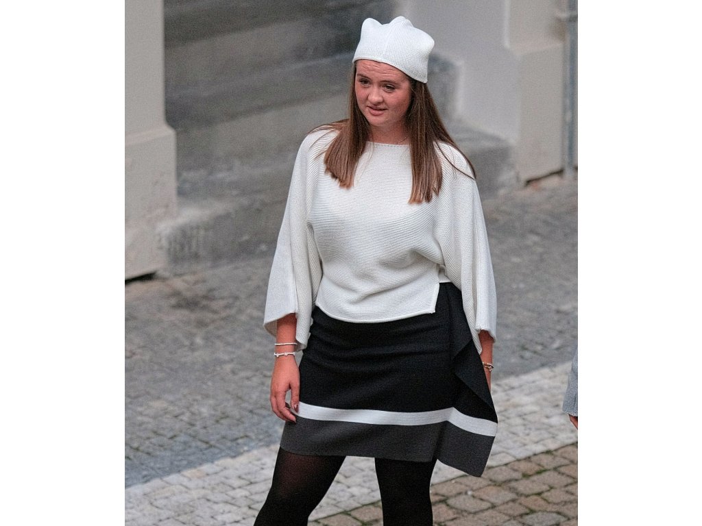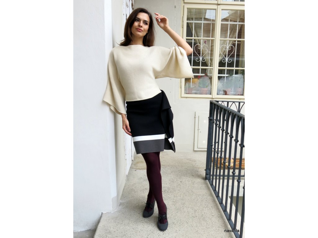 Sukně NILA je originální sukně nad kolena, pletená pevnou vazbou z organické bavlny, s bílým a šedým pruhem a s postranním volánem, v pase dutinka s gumou. Pleteno ze směsové příze ve složení: 50% bavlny a 50% polyesteru. Nekouše, nežmolkuje, údržba velice praktická - praní v pračce na jemný program do 30 st.