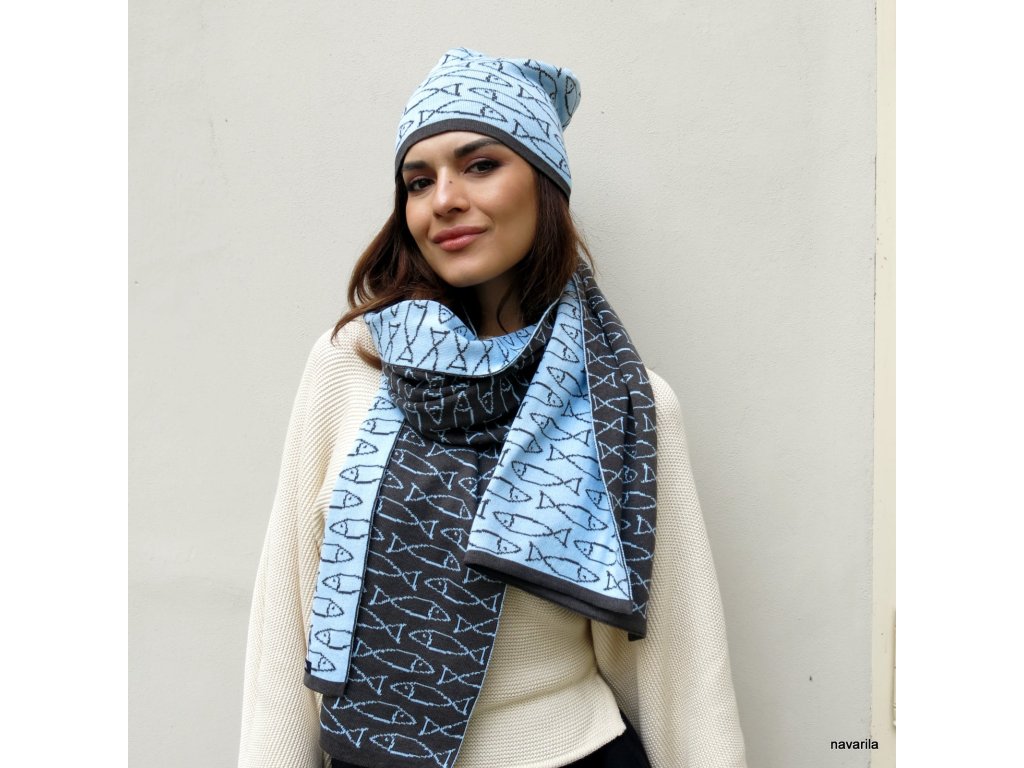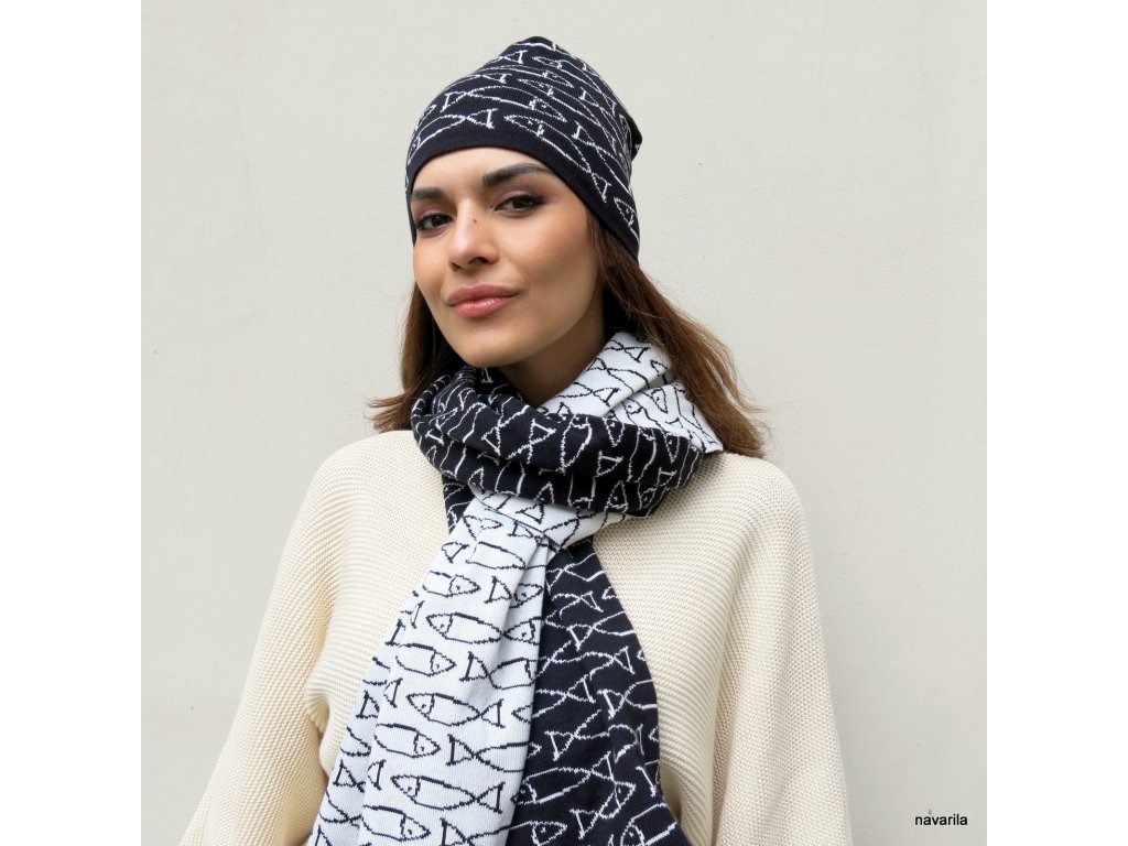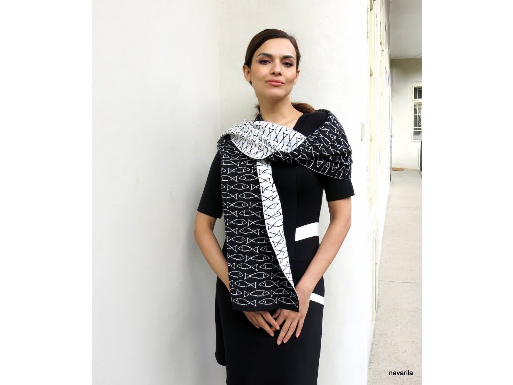 Originální a jedinečná je maxi šála / pléd pletený z biobavlny, rozměry 190 x 50 cm, autorský vzor s rybičkami. Pletená ze směsové příze ve složení 50%bavlna a 50% polyesteru. Úplet je již předepraný -údržba velice praktická - praní v pračce na jemný program. POTOM PROPAŘIT ŽEHLIČKOU. Barevnost: A/černo-bílá B/modro-šedá C/fialovo-růžová D/růžovo-bílá