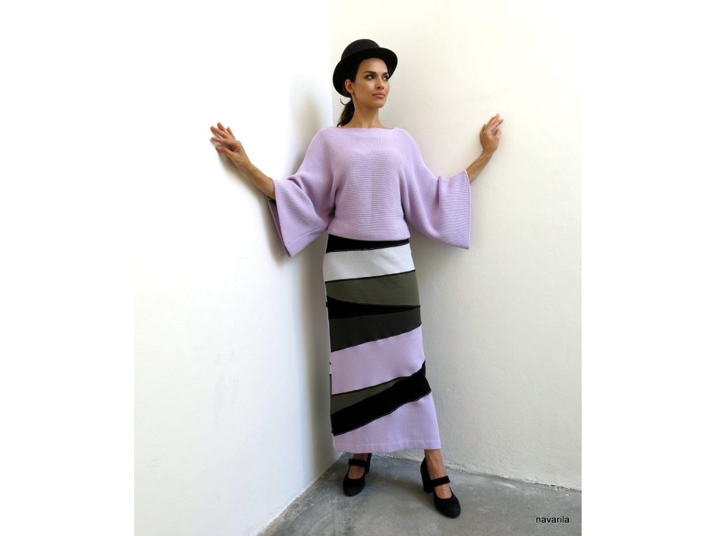 Originální, mírně rozšířená maxisukně, sešívaná z recyklovaných dílů, vzniklých při výrobě jiných modelů. Všechny švy jsou z lícu prošité ozdobným cowerlookovým stehem. Jedinečný originál, vyjimečná a nepřehlédnutelná sukně. Pouze na objednávku do 14 dnů, dle vašich zaslaných měr, nikdy nebude zcela totožná barevná skladba dílů jako na fotce. Materiál- pleteno z Biobavlny 50/50 PES Údržba velice praktická - ruční praní nebo v pračce na jemný program do 30st. Vyrobeno s láskou v Čechách, každý kus originál - ruční výroba Foceno s topem VIGO: https://navarila.com/obchod/vigo-top-ponco-s-kimonovymi-rukavy/