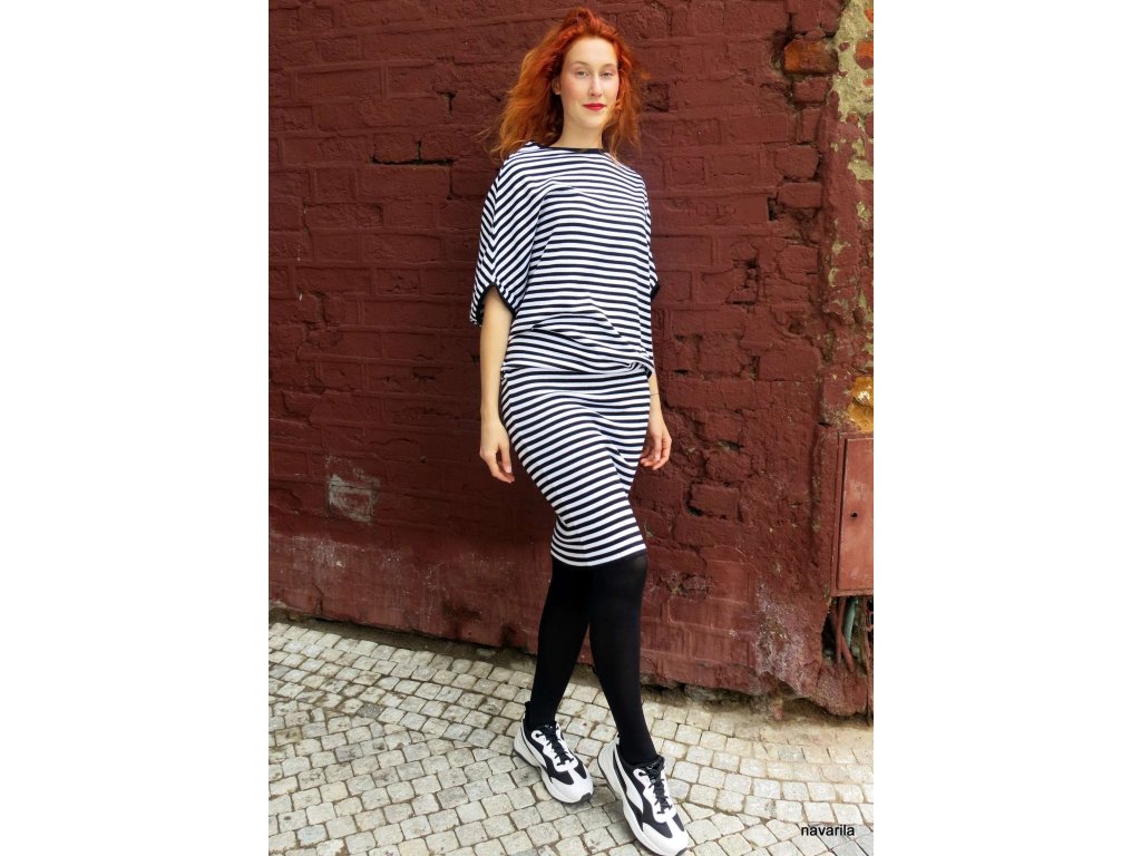 Jednoduché tvarem, bohaté svým využitím jsou kimonové šaty- tunika, černobíle pruhované s lodičkovým výstřihem.Dolní část šatů je pletená jemným žebrem, takže je možno šaty podkasat jako minisukni nebo nechat šaty dlouhé do půli lýtek.Materiál- bavlněná příze s příměsí kašmíru. Veškeré modely jsou již předeprány, snadná údržba- praní na jemný program v pračce do 30 st. Po vyprání rozprostřít na ručník. Velikosti S, M, L, XL.
